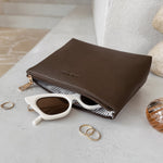 Love my purchase. Love the chocolate brown. Fits all my travel makeup. Absolutely love the lining. Also use it as a clutch on a night out. Very classy.