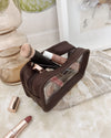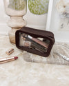 The Baby Fergie Chocolate Cosmetic Bag brings a refined, travel-ready feel to your beauty routine. Designed as a clear makeup bag with vegan leather trim, she blends transparency with structure for effortless access to your essentials. Crafted from smooth vegan leather and clear plastic, and finished with light gold hardware, she offers a chic yet functional way to store your must-haves. Compact and secure with a zip closure, Baby Fergie Chocolate fits seamlessly into handbags, carry-ons, and everyday life.