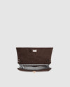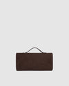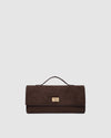 Poised and polished, the Delaney Chocolate Suedette Clutch is both statement and staple. Crafted from rich chocolate faux suede and finished with light gold hardware, she embodies effortless sophistication, equally at a café on a marble café table or tucked underarm on an evening promenade. Designed as a refined flap envelope clutch, her structured silhouette offers an elevated touch, while her form also works beautifully as a top handle bag with a fixed handle and optional crossbody strap for styling versatility. A classic turn-lock closure opens to a thoughtfully organised interior with a considered zip pocket; an understated detail designed with intention. Sleek yet softly bold, Delaney Chocolate Suedette is made for the woman who knows that true style speaks softly, a whisper of Parisian ease, carried beautifully à la français.