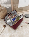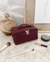 The Ellis Burgundy Makeup Bag is a compact beauty organiser designed for effortless access and convenience. Crafted from buttery soft vegan leather and accented with gold hardware, she blends functionality with a refined finish. With her wide opening and clever silhouette, Ellis lies completely flat when unzipped, so every product is visible and within easy reach. Inside, two main compartments, a zip pocket, and three slip pockets create designated spaces for your makeup, brushes, and skincare, keeping everything neatly in place. Perfect for jetsetters or anyone who loves an organised vanity, Ellis pairs perfectly with the larger Orion Cosmetic Case for a complete travel set.