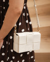 The Josephine Vanilla Crossbody Bag is a statement in both texture and versatility, designed to deliver effortless elegance from day to night. Crafted from woven vegan leather panels, she offers a modern twist on classic texture, adding a refined edge to everyday styling. This women’s woven handbag features a structured silhouette with a magnetic closure to keep your essentials secure, while light gold hardware lends a polished finish. With two interchangeable straps: a sleek vegan leather crossbody and a gold, short shoulder chain strap - Josephine Vanilla adapts to suit your style. Wear her crossbody for hands-free ease, on the shoulder for elevated occasions, or remove both straps for a sophisticated clutch moment. Thoughtfully designed for both function and flair, Josephine Vanilla is the perfect plus-one for long lunches, late nights, and everything in between.
