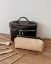 The Juliette & Brianna Black Cosmetic Case Set is a beauty bag set with makeup brushes, thoughtfully crafted to keep your routine organised in style - whether at home or away. This travel-ready cosmetic bag duo with zip closures strikes the perfect balance between elegance, function, and portability. The Juliette Vanity Case, made from buttery soft vegan leather, features a sleek, structured silhouette with five compartments and three slip pockets - ideal for storing skincare, makeup, and beauty essentials. A practical top handle and refined hardware details add a touch of everyday luxury to your routine. Complementing her is the Brianna Makeup Bag, which pairs soft vegan leather with raffia texture for a relaxed, elevated look. Complete with six essential makeup brushes, Brianna is your go-to for effortless touch-ups on the move. Chic, compact, and considered, the Juliette & Brianna Set is the perfect companion for beauty lovers who never compromise on style.