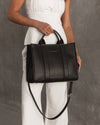 The Manhattan Black Tote Bag is a polished everyday companion, designed to balance refined style with practical function. Made with smooth, structured vegan leather, Manhattan features top-stitched trims and statement handles for a sleek, contemporary finish. Her mid-sized silhouette offers ample space for your workday essentials, including a 15-inch laptop, while remaining streamlined enough for after-hours plans. Designed for versatility, she can be carried by the top handles for a classic look or worn crossbody with the adjustable, detachable strap for hands-free ease. Understated yet distinctive, Manhattan transitions effortlessly from office meetings to evening outings, offering timeless appeal for the modern woman on the move.