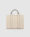 The Manhattan Biscotti Tote Bag with Black Trim is a polished everyday companion, designed to balance refined style with practical function. Made with smooth, structured vegan leather, Manhattan features top-stitched contrast trims and statement handles for a sleek, contemporary finish. Her mid-sized silhouette offers ample space for your workday essentials, including a 15-inch laptop, while remaining streamlined enough for after-hours plans. Designed for versatility, she can be carried by the top handles for a classic look or worn crossbody with the adjustable, detachable strap for hands-free ease. Understated yet distinctive, Manhattan transitions effortlessly from office meetings to evening outings, offering timeless appeal for the modern woman on the move.